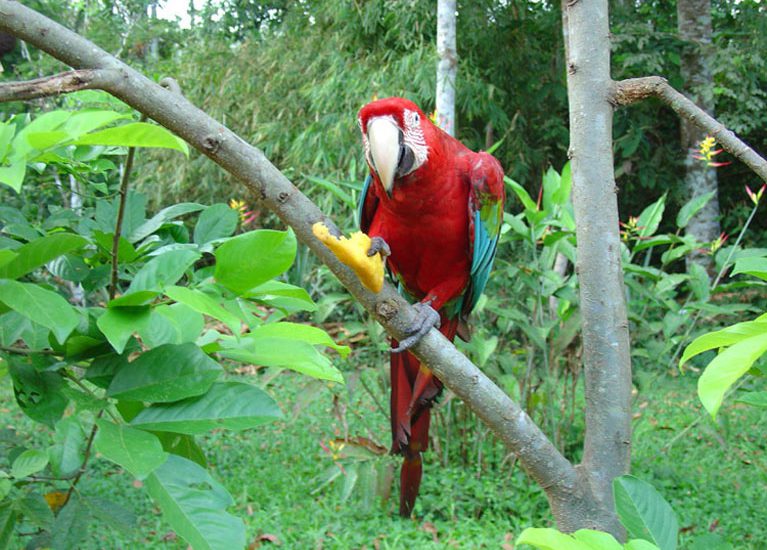 Macaws gather near a cliff to eat the mineral rich clay. This one discovered people can provide even tastier treats.