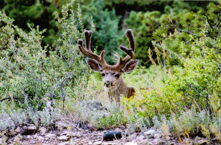 A fuzzy antlered mule deer in spring popped up from behind a hill and scared me but allowed enough time to get this shot